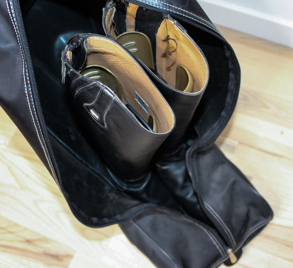 Grunden til at mine støvler har holdt sig så godt i alle de år, er at jeg har haft dem i en støvletaske. Den på billedet er købt i Horze for mange år siden. Det er en simpel støvletaske som mine støvler altid er i når jeg ikke er ude og ride. Det beskytter skoen så den ikke får støv eller skrammer.